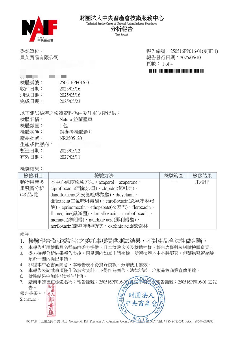 Nutura 益菌靈草|權威檢驗合格報告